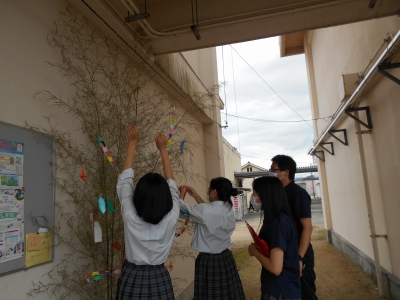 家庭科棟に笹の葉と七夕飾りを設置しました。生徒は思い思いに自分の願い事を書いて飾っています。2・3年……