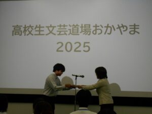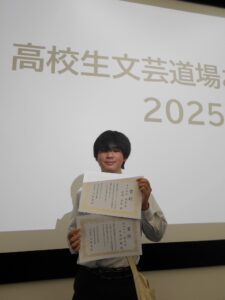 もう1つは、9月27日(土)に就実大学で開催された県大会「文芸道場おかやま2025」俳句部門に事前に応募し、プロの作家の方による審査によって、「優秀賞」(第2位相当)を受賞しました。「夕立が ダンスのステップ 傘の上」という俳句で、巧みな擬人法が高く評価されました。