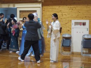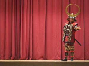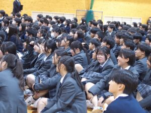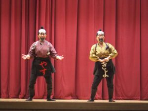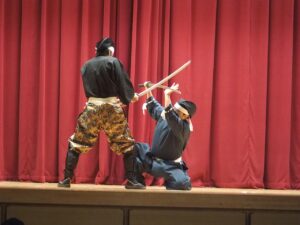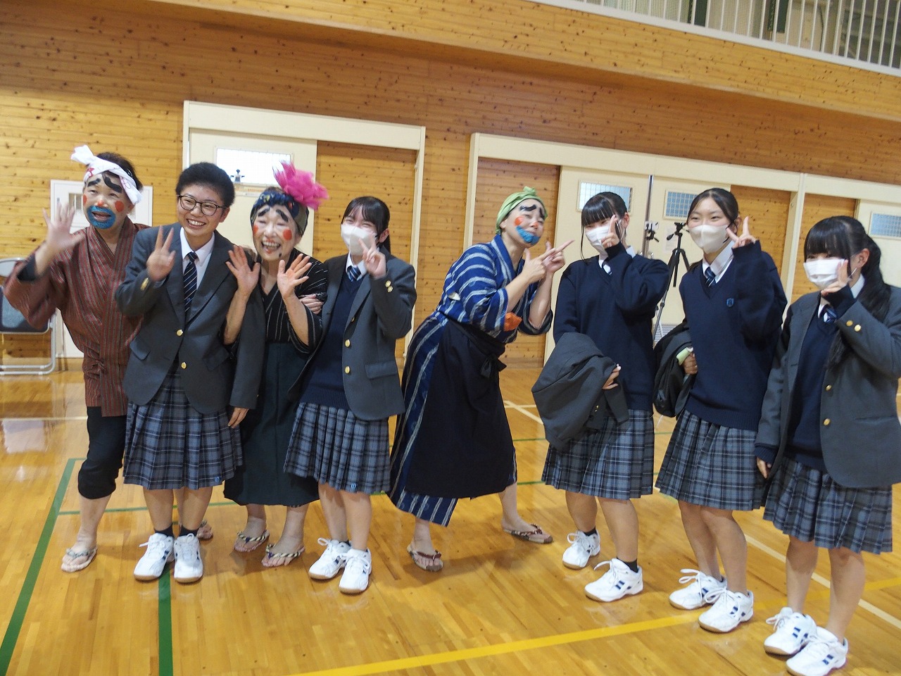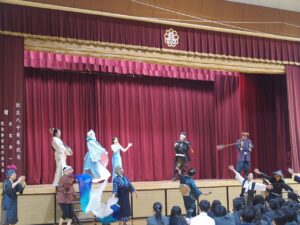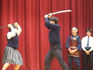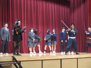 瀬戸内市ともゆかりのある宇喜多家を題材に、笑いを取り入れた舞台や殺陣師さんによる殺陣教室を開催してくださり生徒たちも大いに楽しんでいました。