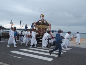 神社班3名は、朝から牛窓神社に集合して、お神輿のご神幸に密着し、宮司さんの補助をしたりお神輿を担いだりしながら、お神輿が各地区をまわる様子を見ていきました。