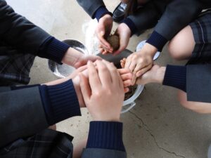 邑久高校生と一緒にどろだんご教室